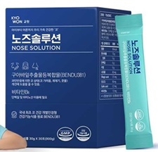 이 회사가 세번째로 선보이는 ‘노즈솔루션’은 일상생활 속 각종 외부환경 변화로 인한 자극으로부터 코건강 개선을 돕는다. 재채기, 콧물 등 과민반응에 의한 코 상태 개선에 도움을 준다고 한다. 국내 최초 코건강 개별인정형 건기식 원료인 구아바잎추출물 등 복합물(BENDU381)과 단백질 및 아미노산 이용에 필요한 비타민B6가 함유됐다. 이는 체내 에너지대사와 영양균형 관리에 도움을 줄 수 있다.