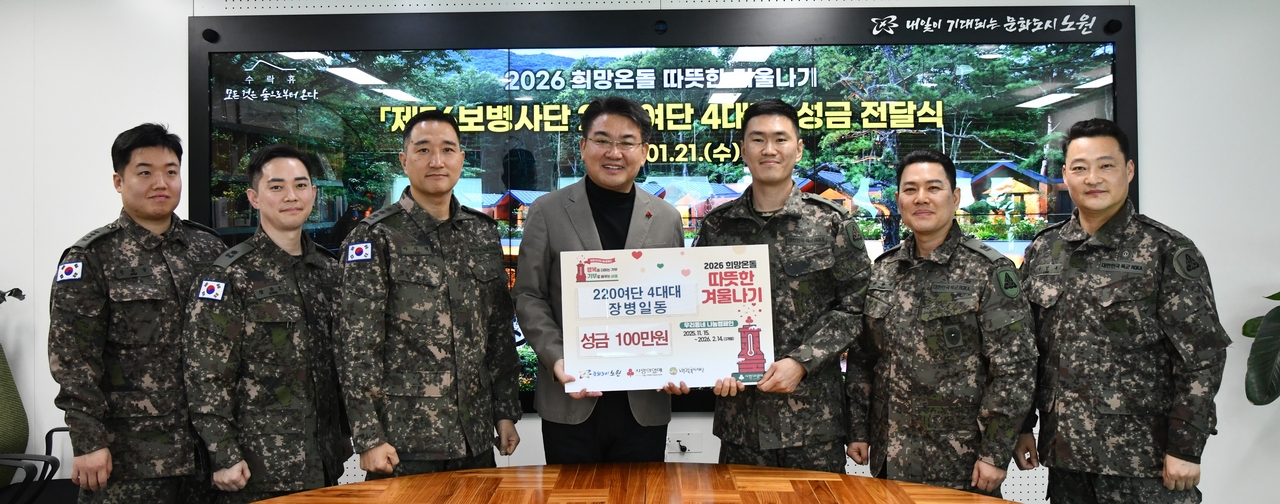 | 오승록 노원구청장과 군인들이 성금 전달식에 참석하여 카메라를 응시하며 미소짓고 있는 사진이다.배경에는 ‘2024 희망온돌 따뜻한 나눔, 제56보병사단 4대대 성금 전달식, 01.21(수)’라고 적힌 글자가 보인다. |