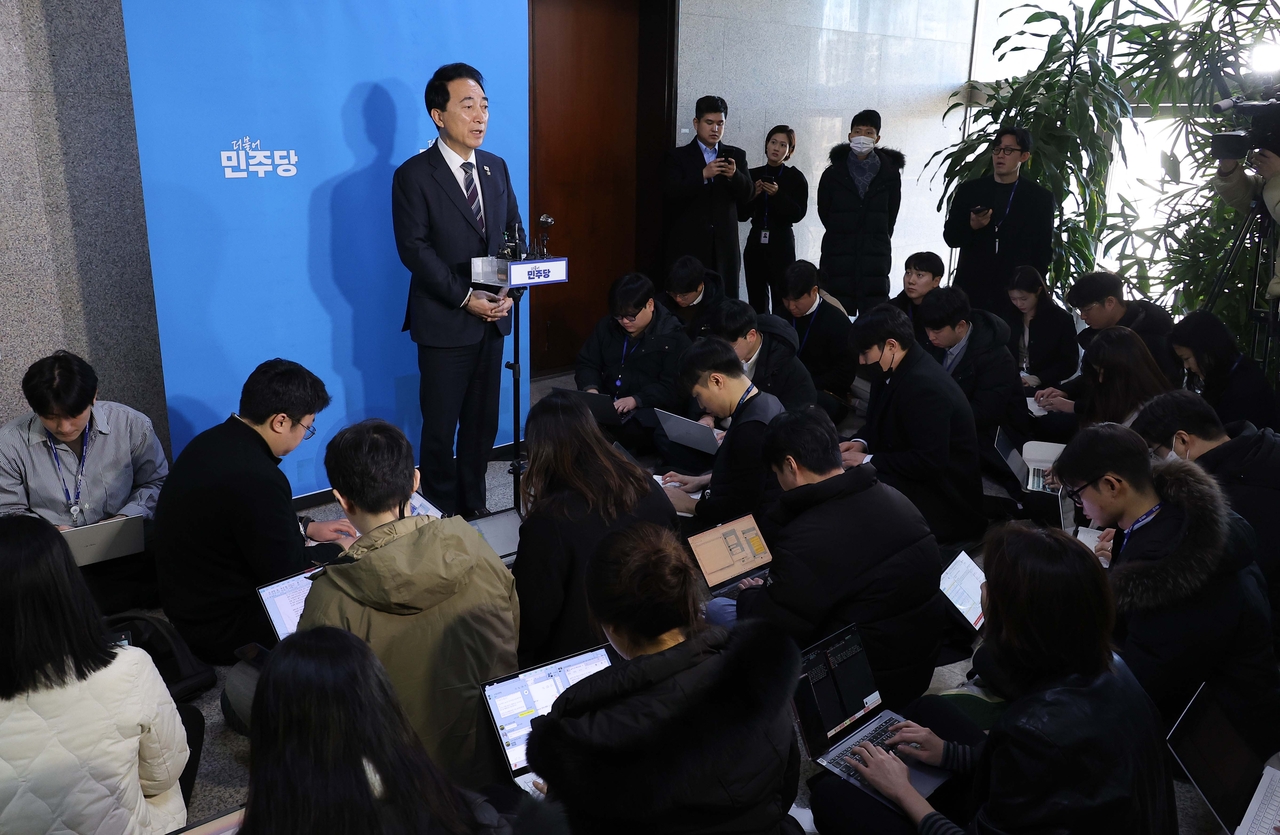 | 박수현 더불어민주당 수석대변인이 22일 정청래 대표가 기자회견을 통해 밝힌 조국혁신당과의 합당 제안에 대한 배경 설명을 하고 있다. [연합] |