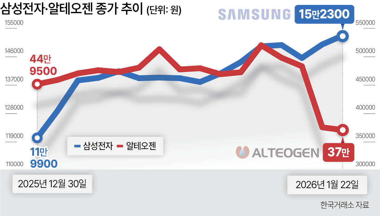 코스피 시총 1위 삼성전자는 최고치 경신을 거듭하며 코스피 질주를 견인하고 있다. 코스닥 시총 1위 알테오젠은 오히려 코스닥보다 낮은 수익률로 코스닥에 부담을 주는 형국이다.