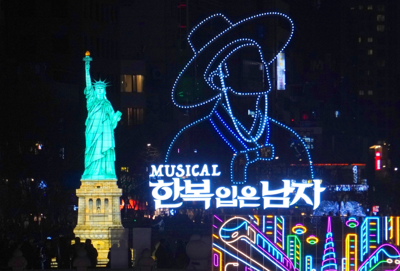 | 서울에 나타난 뉴욕 자유의여신상과 케이팝데몬헌터스 사자보이즈 한복입은남자. 서울 빛초롱 축제 모습 |