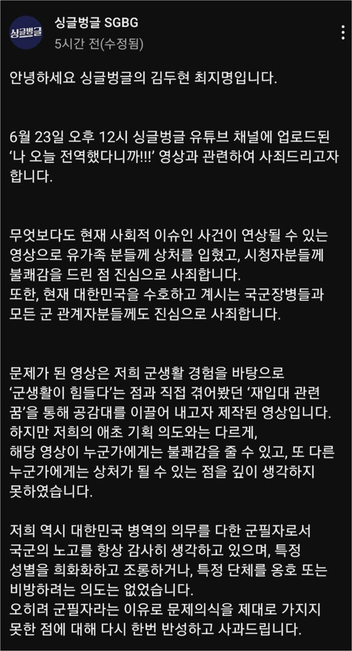 | 당시 싱글벙글이 올린 사과문. [유튜브 채널 싱글벙글 캡처] |