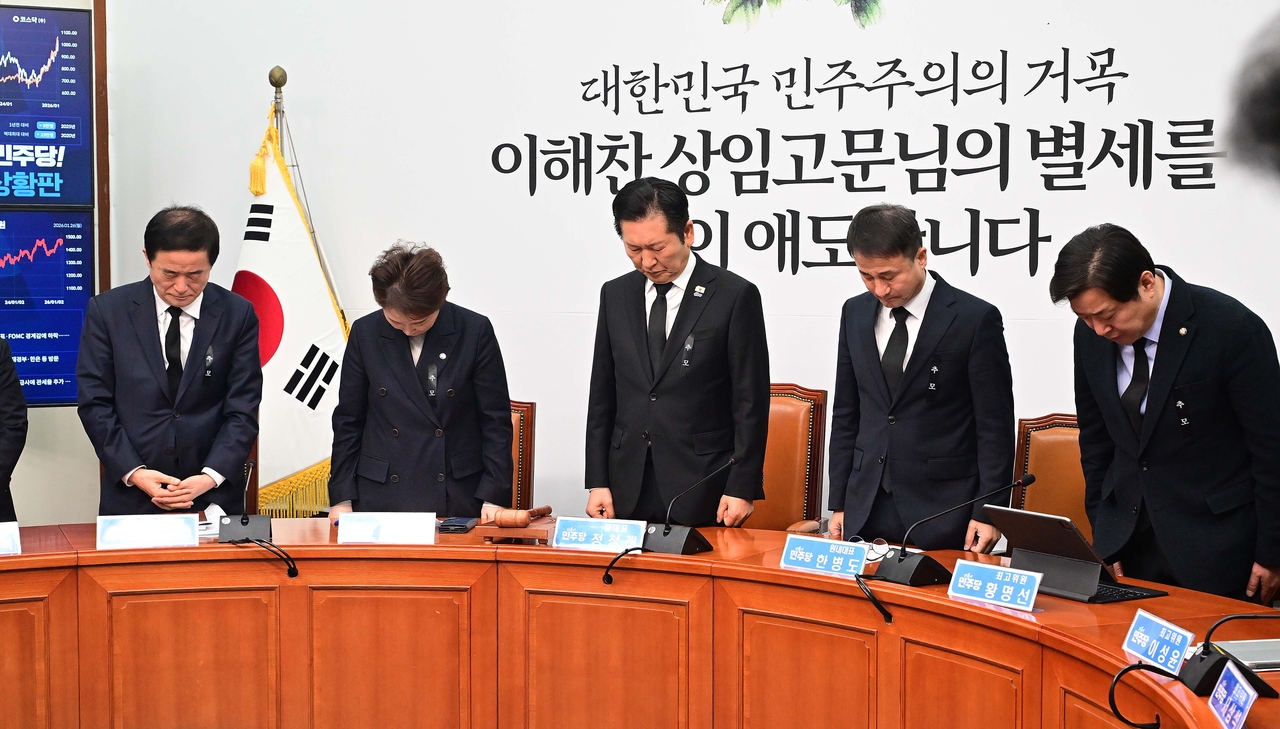 | 정청래 더불어민주당 대표와 한병도 원내대표를 비롯한 최고위원들이 26일 국회에서 열린 최고위원회의에서 이해찬 전 국무총리의 별세를 애도하며 묵념하고 있다. 이상섭 기자 |