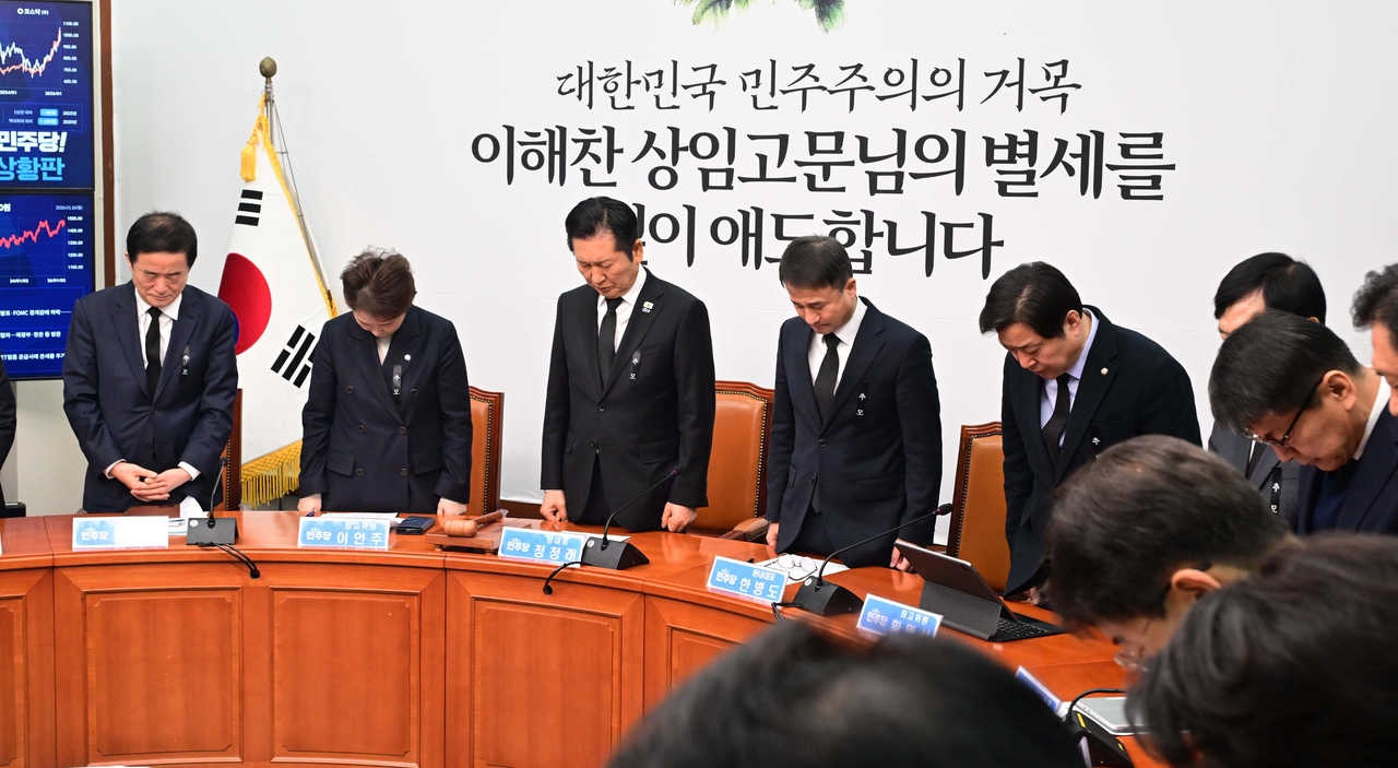 | 정청래 더불어민주당 대표와 한병도 원내대표를 비롯한 최고위원들이 26일 국회에서 열린 최고위원회의에서 이해찬 전 국무총리의 별세를 애도하며 묵념하고 있다. 이상섭 기자 |