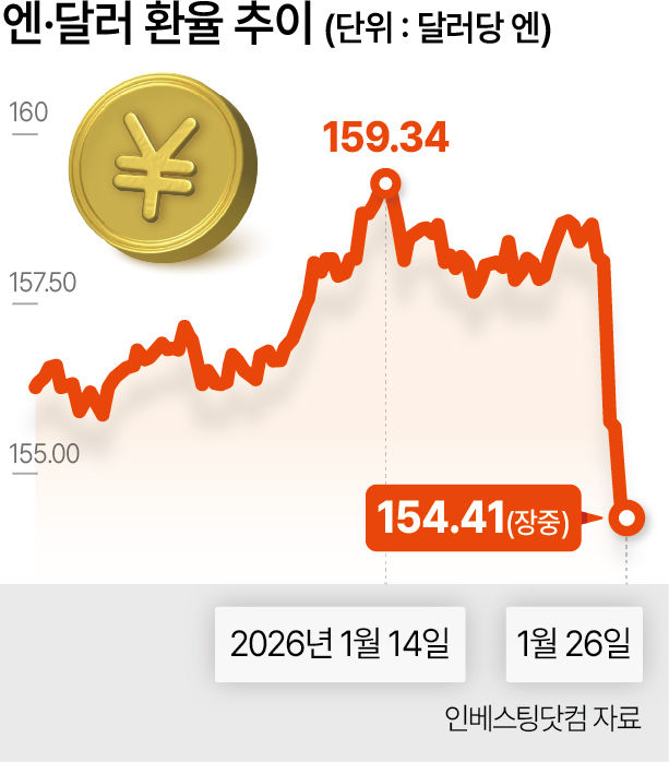 엔·달러 환율은 이날 도쿄 외환시장에서 한때 154.41엔까지 내려갔다. 지난 14일 달러당 159.34엔까지 올라갔던 것에 비해 약 3% 하락한 수준이다. 엔·달러 환율이 154엔대로 내려간 것은 지난해 12월 16일 이후 약 1개월 반 만이다.