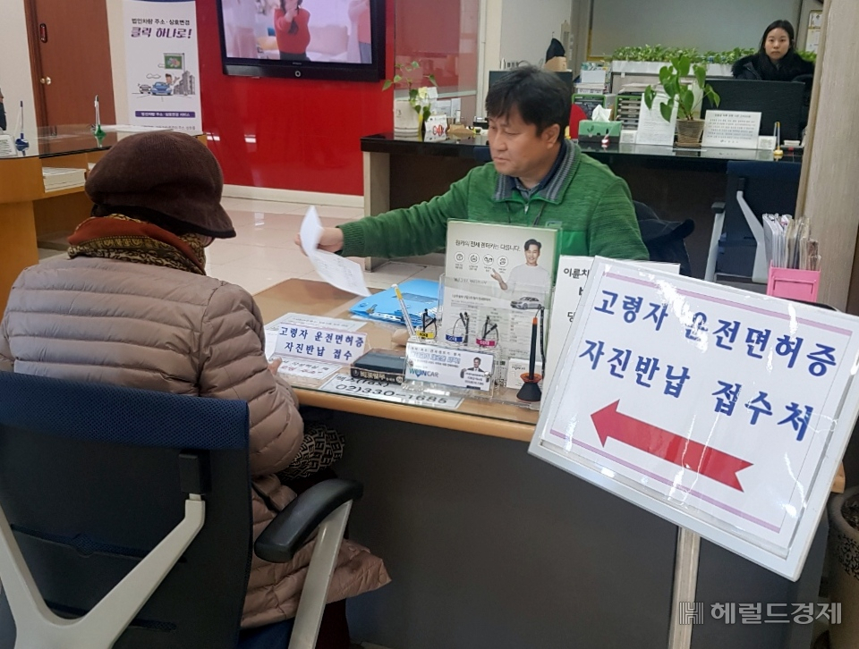 | 서울의 한 어르신이 관할 동주민센터에 운전면허를 반납하고 있다. [헤럴드 DB] |