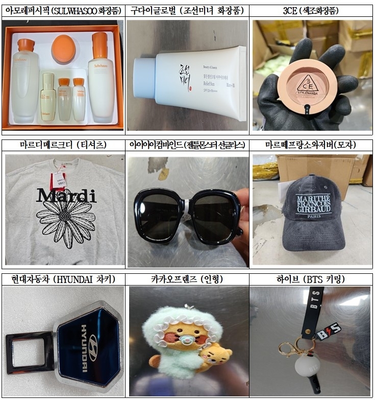 주요 지식재산권 침해 물품은 설화수·조선미녀·3CE 등 화장품을 포함해 마르디메르크디 티셔츠, 젠틀몬스터 선글라스, 마르떼프랑소와저버 모자, 카카오프렌즈 인형 등이었다.