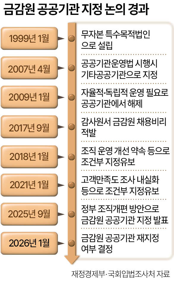 금감원은 앞서 2007년 공공기관운영법 시행 당시 ‘기타공공기관’으로 지정됐으나 독립성과 자율성 보장을 위해 지정 2년 만인 2009년 해제된 바 있다. 이후에도 여러 차례 재지정 논의가 이뤄졌으나 독립성 보장 등의 이유로 유보 결정이 내려져 왔다.