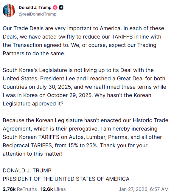 한국 국회가 우리의 역사적인 무역 협정을 제정하지 않았기 때문에, 나는 이에 대한 대응으로 한국산 자동차, 목재, 의약품 및 기타 모든 상호 관세 품목에 대한 관세를 15%에서 25%로 인상한다.
