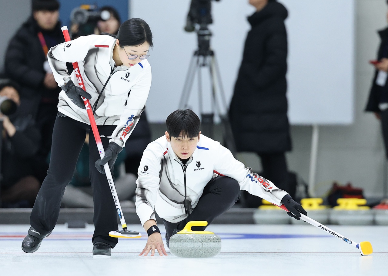 | 2026 밀라노·코르티나 동계올림픽 컬링 믹스더블에 출전하는 김선영, 정영석이 충북 진천선수촌에서 훈련을 하고 있다. [연합] |
