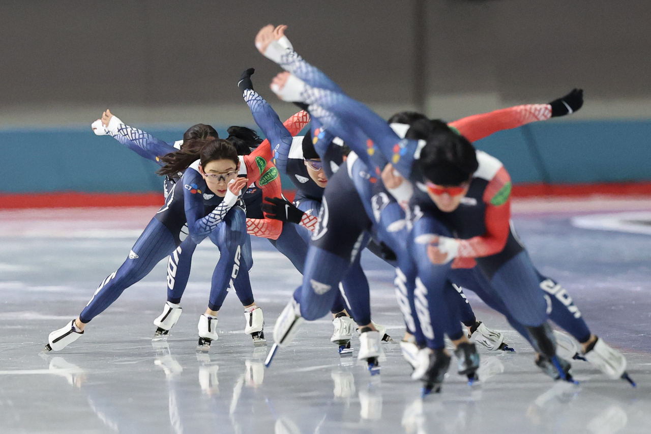 | 스피드스케이팅 대표팀 선수들이 서울 노원구 태릉선수촌에서 훈련하고 있다. [연합] |