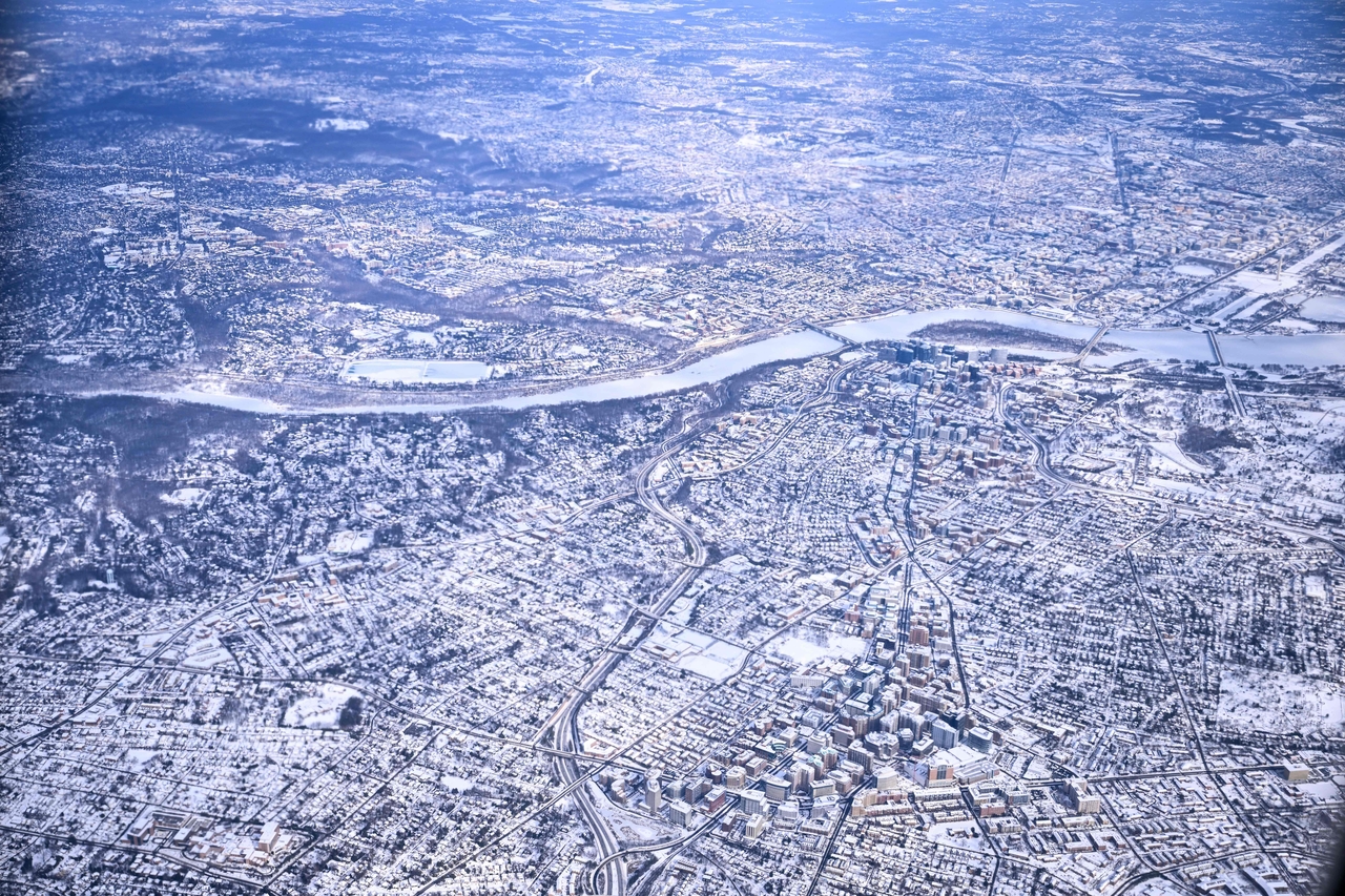 | 27일(현지시간) 대통령 전용기 에어포스원에서 내려다본 버지니아주 알링턴 일대가 눈으로 덮여 있다. [AFP] |
