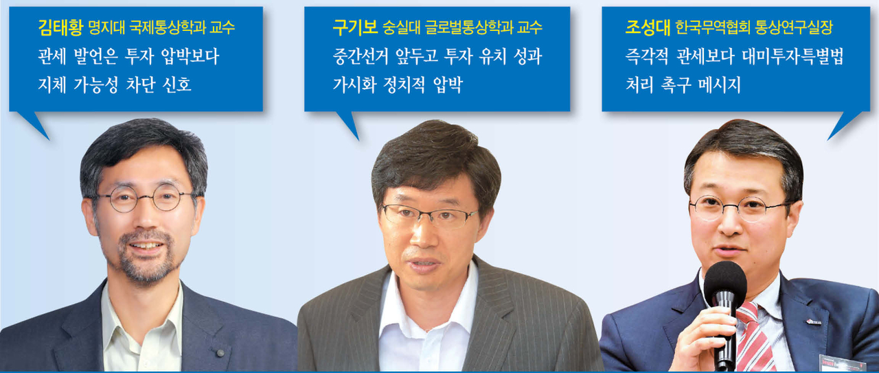 조성대 실장은 “아직 실제 관세 부과를 위한 후속 조치나 공식 문서가 나온 것은 없는 만큼, 국회 일정과 국내 절차를 충분히 설명하며 대화를 이어가는 것이 중요하다”고 말했다. 구기보 숭실대 글로벌통상학과 교수는 “조속한 입법 의지를 전달하며 협상 여지를 넓혀야 한다”고 지적했다.