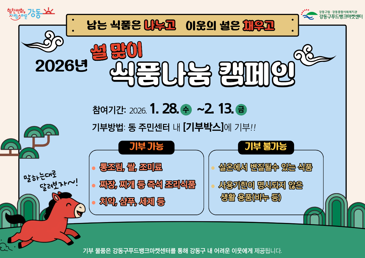 [헤럴드경제=박종일 선임기자]서울 강동구(구청장 이수희)는 다가오는 설 명절을 맞이하여 복지 사각지대 주민을 지원하고 나눔 문화를 확산하기 위해 오는 1월 28일부터 2월 13일까지 ‘2026년 설 맞이 식품 나눔 캠페인’을 추진한다.