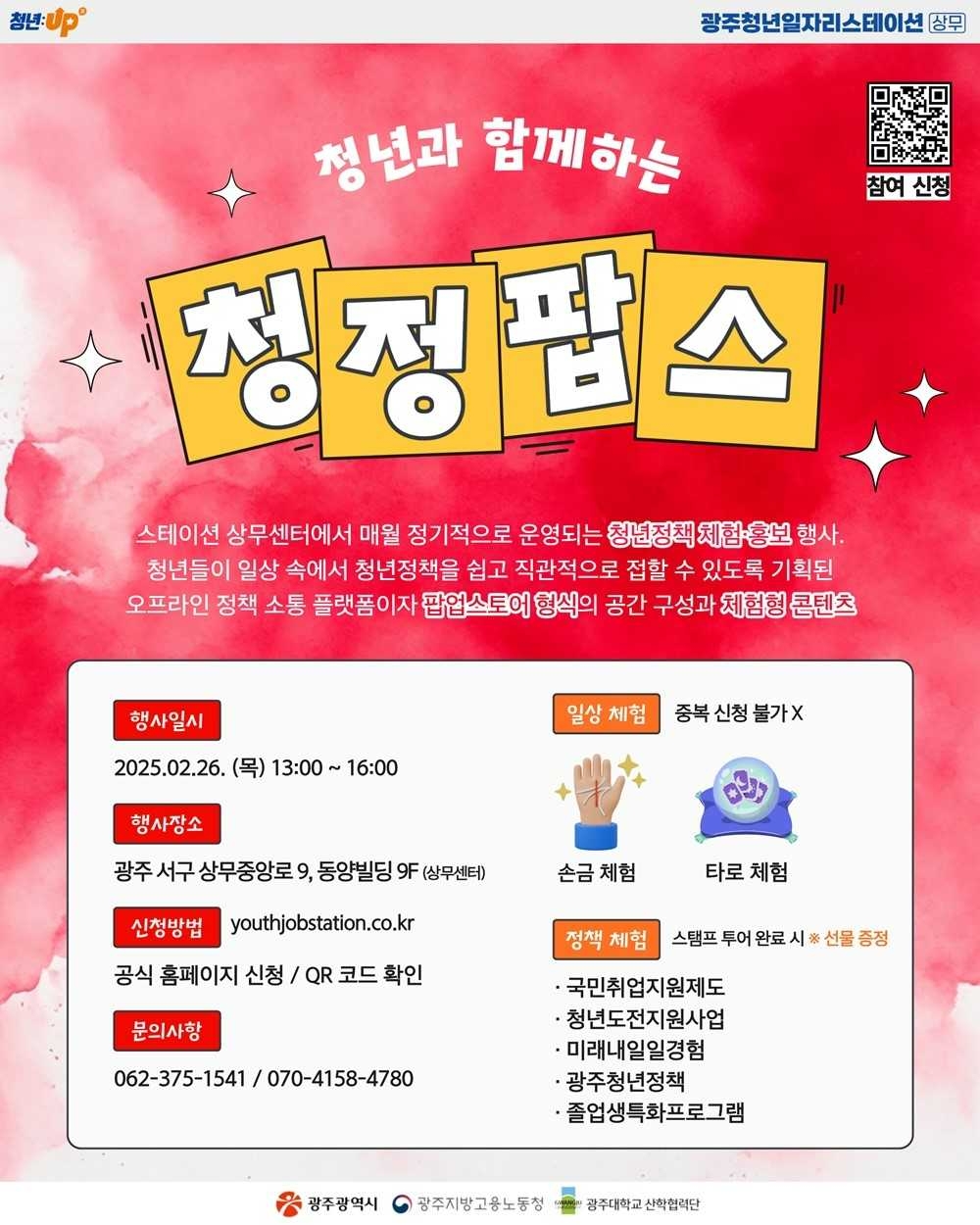 [헤럴드경제(광주)=서인주 기자] 광주대학교 산학협력단이 위탁 운영하는 광주청년일자리스테이션 상무센터(센터장 조유근, 광주대 회계세무학과 교수)는 오는 2월 26일 지역 청년을 위한 청년정책 홍보 행사인 ‘청정팝스(청년정책 팝업스토어)’를 개최한다.