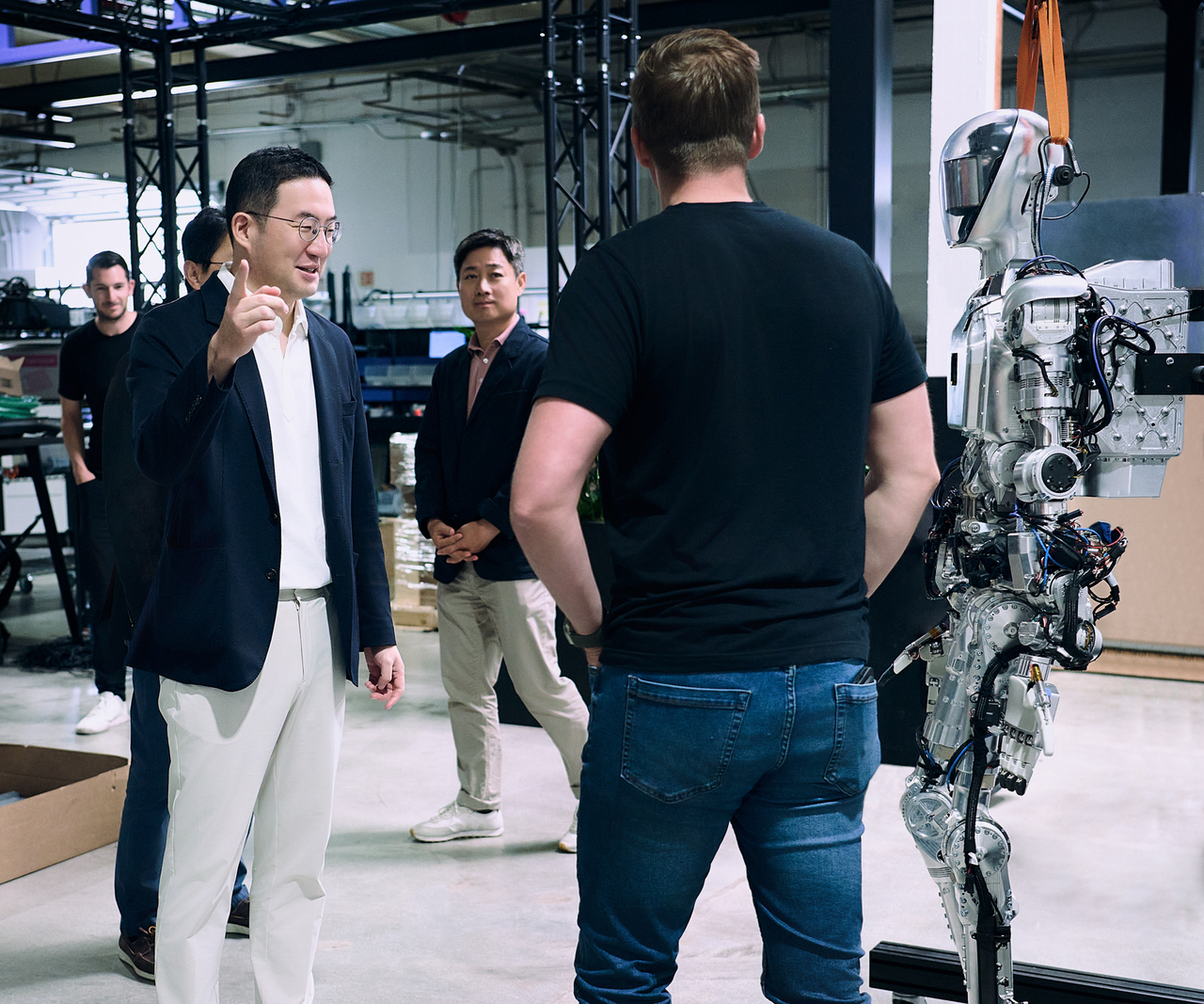 | 구광모(왼쪽) LG그룹 회장이 미국 실리콘밸리에 위치한 로봇 개발 스타트업 ‘피규어 AI(Figure AI)’에 방문해 휴머노이드 로봇을 살펴보고 있다. [LG 제공] |