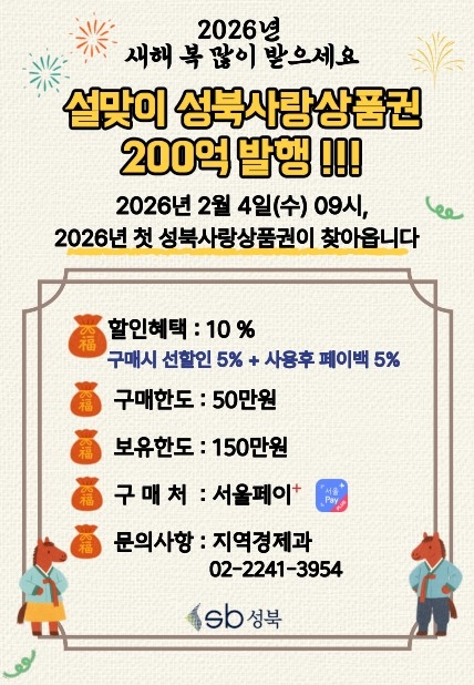 | 2026년 설맞이 성북사랑상품권 200억 발행을 알리는 포스터이다. 2026년 2월 4일 수요일 9시, 2026년 첫 성북사랑상품권이 찾아옵니다, 할인혜택 10%, 구매 시 선할인 5% 플러스 사용 후 페이백 5%, 구매한도 50만 원, 보유한도 150만 원, 구매처 서울페이플러스, 문의사항 지역경제과 02-2241-3954라고 적혀 있다. |