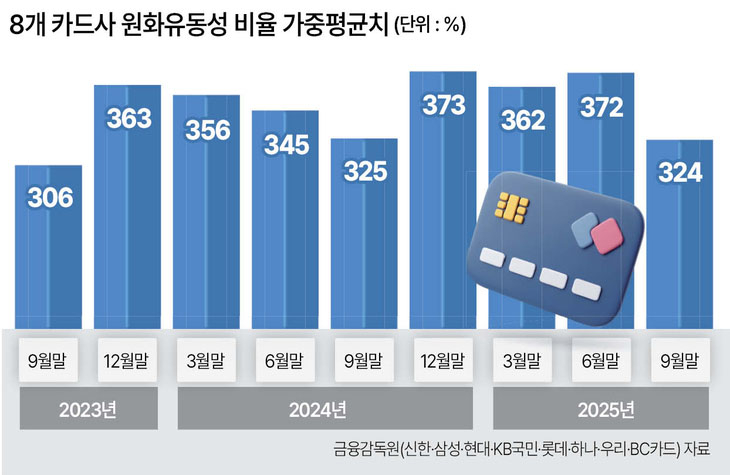 28일 금융감독원 통계에 따르면, 지난해 3분기 전업 카드사의 원화 유동성 가중평균 비율은 324%로 직전분기(372%) 대비 48%포인트하락했다. 이는 2023년 3분기(306%) 이후 최저치다. 현재 모든 카드사가 규제 비율(100%)을 상회하고는 있으나, 전 분기 대비 하락 폭이 커지면서 향후 건전성에 대한 우려가 나온다.