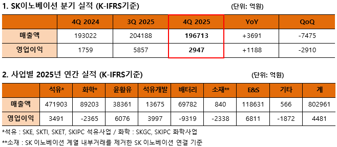 4분기 실적 하이라이트로 SK이노베이션은 EVE에너지와의 합작공장 지분 맞교환(SKOJ-EUE) 및 블루오벌SK 합작체제 종료 등 SK온의 미국 및 중국 합작법인 구조 재편을 통해 배터리 사업의 내실 강화를 추진했다고 밝혔다. 또한 SK온-SK엔무브 합병 및 비핵심 자산 매각 등 포트폴리오 리밸런싱을 통해 사업 경쟁력 확보와 재무구조 안정화를 추진했다고 설명했다.