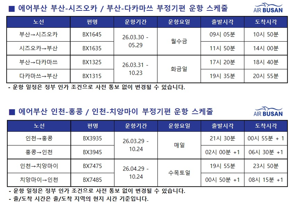 에어부산은 하계 시즌에 맞춰 부산발 ▷시즈오카 ▷다카마쓰, 인천발 ▷홍콩 ▷치앙마이 노선에 부정기편을 투입한다고 29일 밝혔다. 이번 노선 확대는 부산발 일본 소도시 네트워크 강화와 인천발 신규 노선 개설에 초점을 맞췄다.