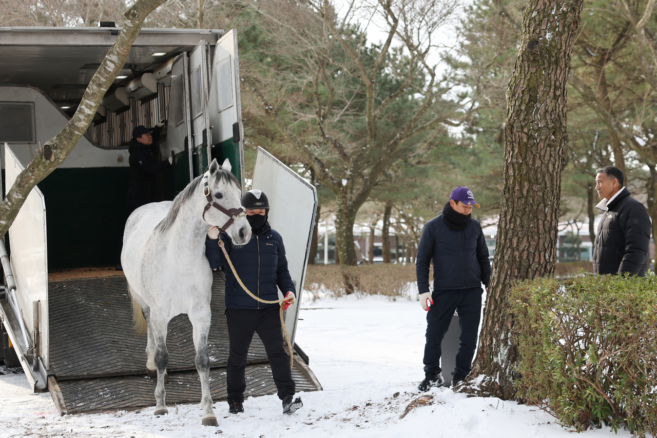 [헤럴드경제=조용직 기자] 명마 ‘닉스고(Knicks Go)’가 지난 23일 한국마사회(회장 정기환) 제주목장에 도착했다. 닉스고는 내달 중순부터 말 농가 교배 지원에 투입된다.