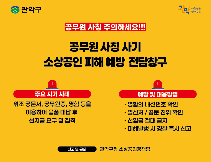 박준희 관악구청장은 “공무원 사칭 사기는 소상공인의 생계를 위협하는 파렴치한 범죄”라고 지적하며, “전담창구 운영을 통해 소상공인이 안심하고 생업에 전념할 수 있는 환경을 조성하고, 예방 중심의 행정 지원을 아끼지 않겠다”고 밝혔다.