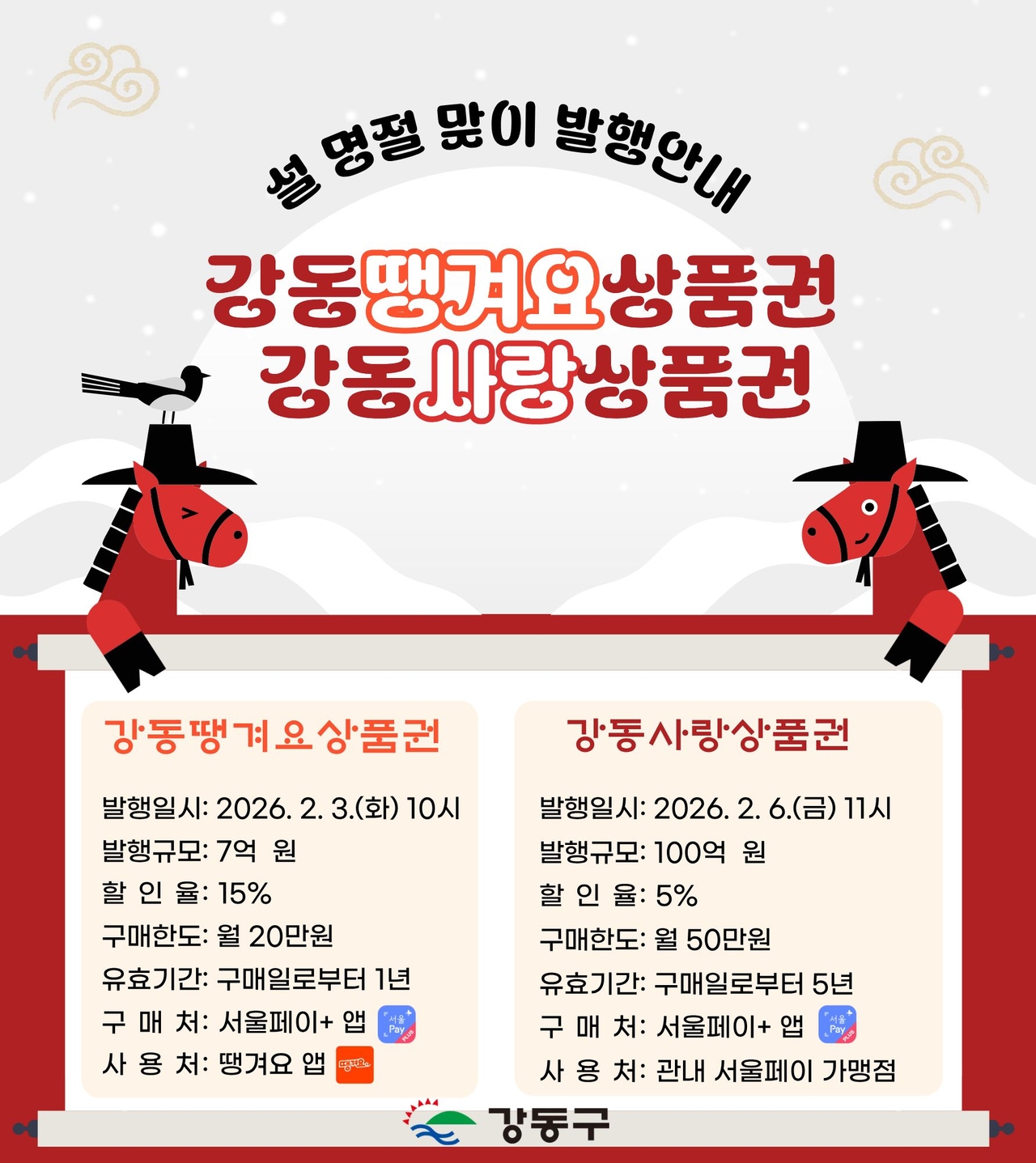 | 설 명절 맞이 발행안내, 강동땡겨요상품권, 강동사랑상품권이라고 쓰여진 홍보 포스터 사진이다. 강동땡겨요상품권은 2026년 2월 3일 화요일 10시에 발행하며, 발행규모는 7억 원, 할인율은 15%, 구매한도는 월 20만 원, 유효기간은 구매일로부터 1년, 구매처는 서울페이플러스 앱, 사용처는 땡겨요 앱이다. 강동사랑상품권은 2026년 2월 6일 금요일 11시에 발행하며, 발행규모는 100억 원, 할인율은 5%, 구매한도는 월 50만 원, 유효기간은 구매일로부터 5년, 구매처는 서울페이플러스 앱, 사용처는 관내 서울페이 가맹점이다. |