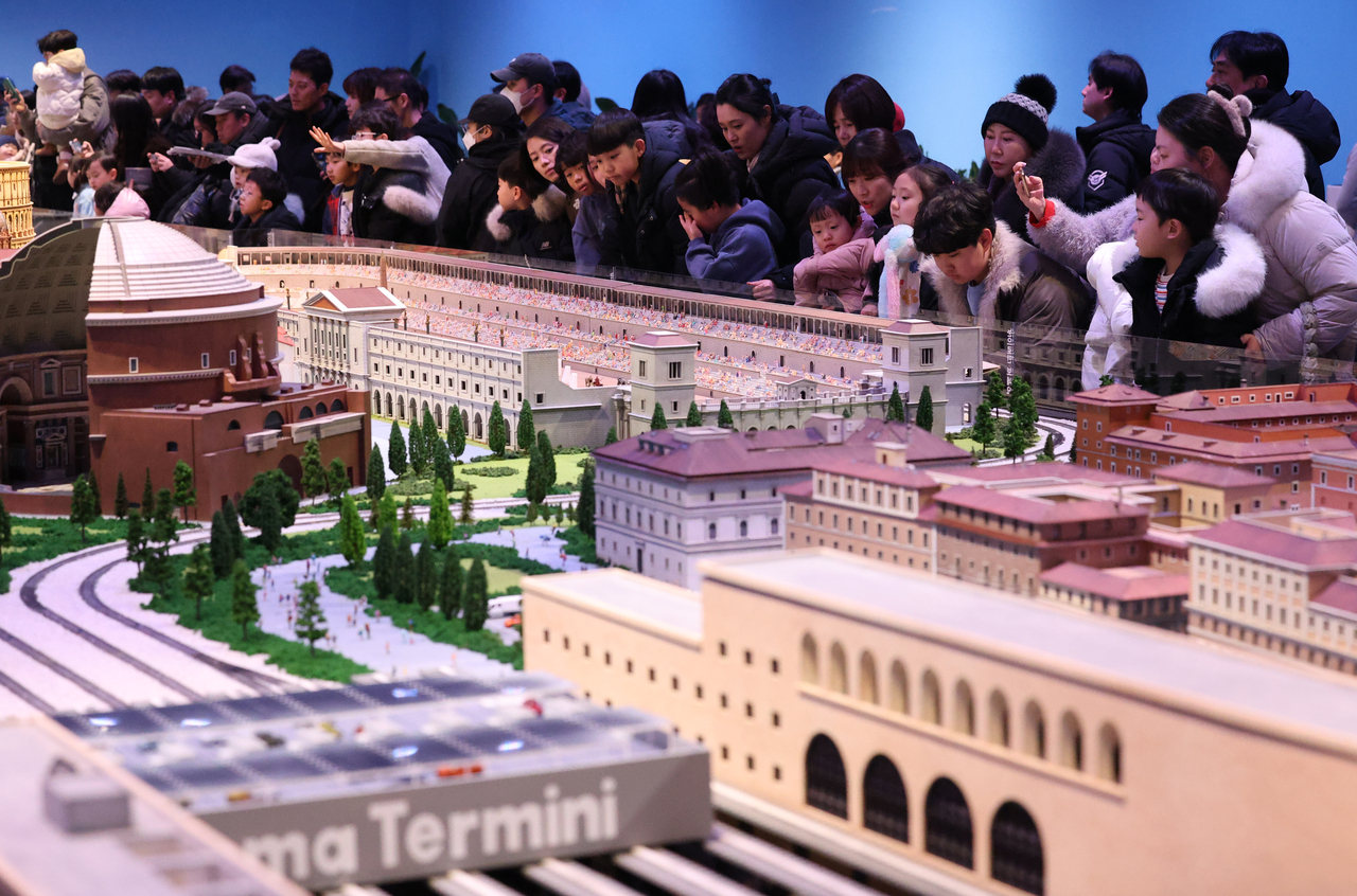 | 노원기차마을 이탈리아관 모형을 둘러보는 아이들과 학부모들 사진이다. 사람들이 이탈리아관 모형을 둘러싸고 설명을 듣고 있다. |