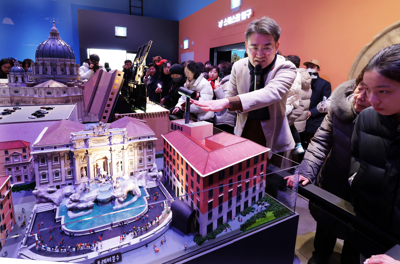 | 오승록 노원구청장이 이탈리아관 모형 앞에서 설명을 하고 있는 사진이다. 사람들은 모형을 둘러싸고 설명을 듣고 있다. |