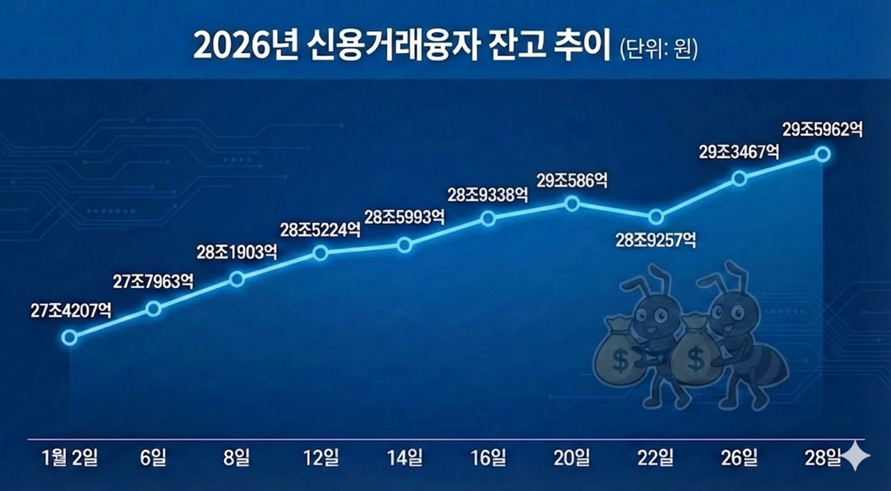 6개월 전인 지난해 8월만 해도 신용거래융자 잔고는 21조원대 수준이었지만, 지난해 12월 5일 처음으로 27조원대를 넘어섰다. 이어 1개월여만인 이달 8일 28조원을 돌파한 데 이어 30조원을 목전에 뒀다.