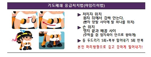 하임리히법은 환자 뒤에서 감싸 안은 뒤 명치 끝과 배꼽 사이를 주먹으로 강하게 밀어 올려 기도에 걸린 이물을 배출하는 응급처치 방법이다. 기도 막힘 증상으로 호흡곤란 등이 발생할 경우 신속하게 응급처치를 시행하는 것이 중요하다.