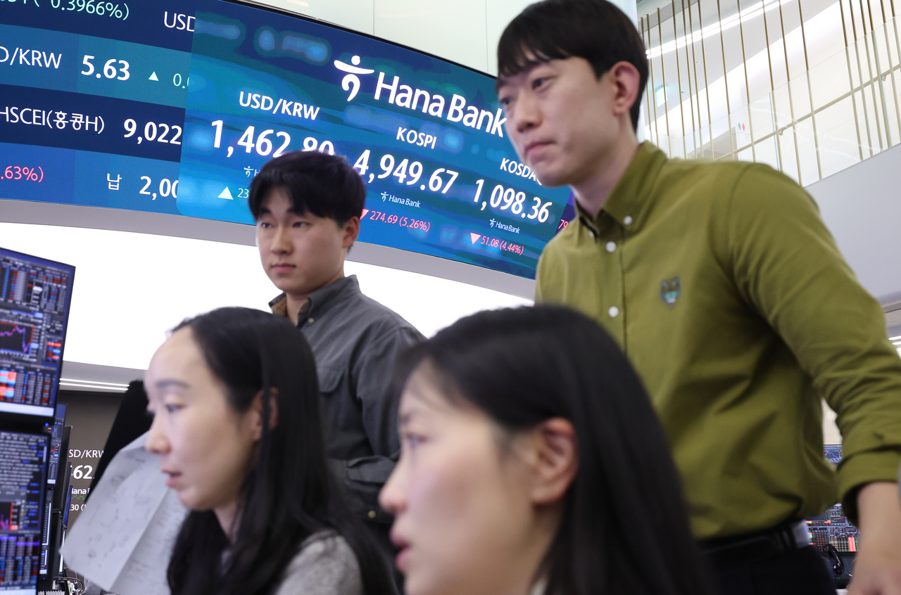 | 코스피가 미국 증시 약세 여파로 인해 5000선 아래로 떨어진 2일 서울 중구 하나은행 딜링룸 현황판에 코스피·코스닥 종가가 표시돼있다. [연합] |