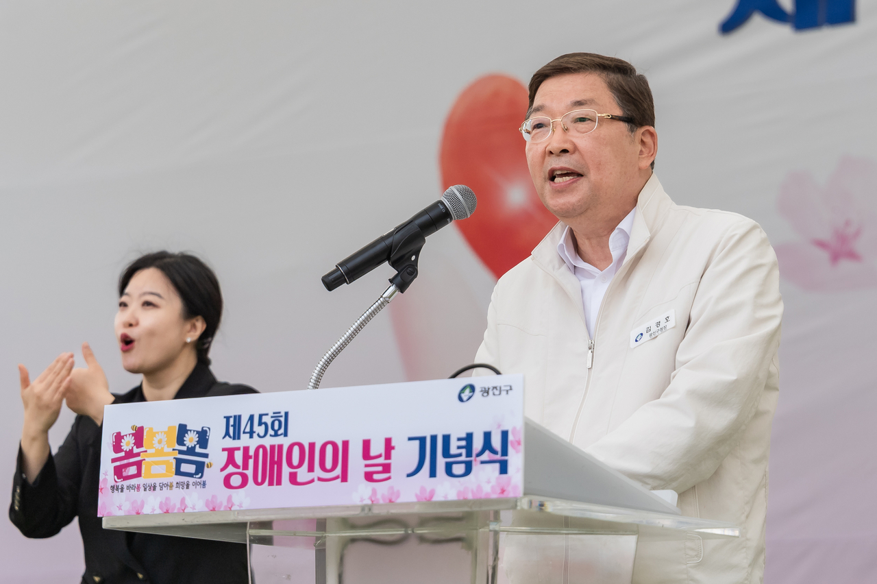 | 김경호 광진구청장이 마이크 앞에서 연설을 하고 있고, 옆에는 수어 통역사가 수어 통역을 하고 있는 사진이다. 배경에는 ‘제45회 장애인의 날 기념식’이라는 텍스트가 쓰여 있다. |
