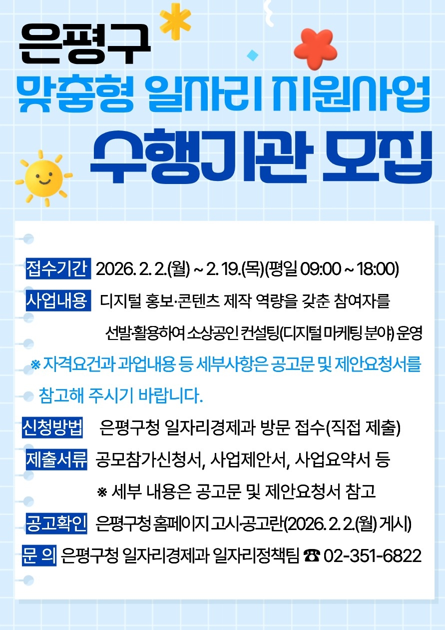 [헤럴드경제=박종일 선임기자]서울 은평구(구청장 김미경)는 맞춤형 일자리 창출과 지역 소상공인의 디지털 경쟁력 강화를 위해 ‘2026년 중장년 새출발 퇴직자 등 맞춤형 일자리 지원사업’ 수행기관을 공개 모집한다.