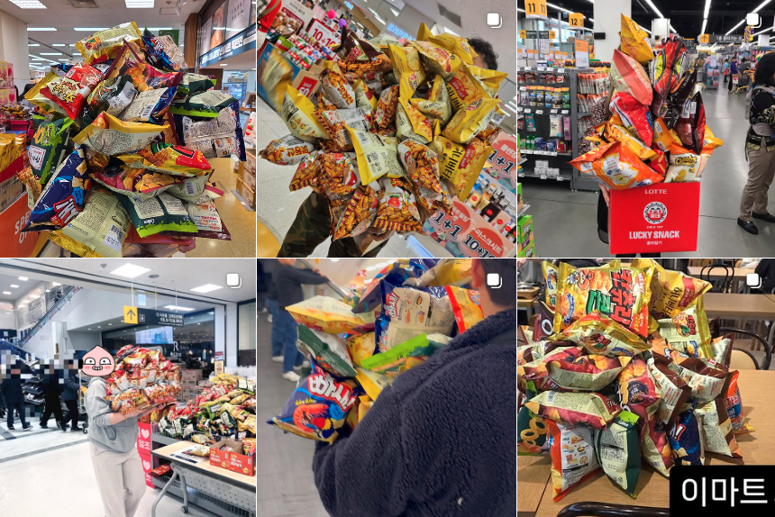 | 이마트가 진행 중인 ‘과자 무한 골라 담기’ 행사에 참여한 소비자들이 SNS에 올린 인증샷. [인스타그램 캡처] |