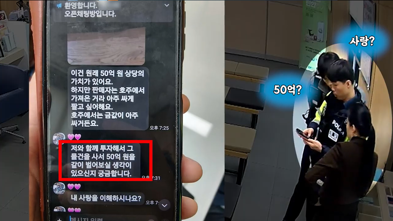 A씨는 외국인으로 추정되는 인물 B씨와 여러 차례 연락을 주고받고 돈을 송금하려 했고, 직원은 사기를 의심하며 경찰에 ‘정기예금을 찾는 할머니의 카카오톡 내용이 의심된다’고 신고했다.