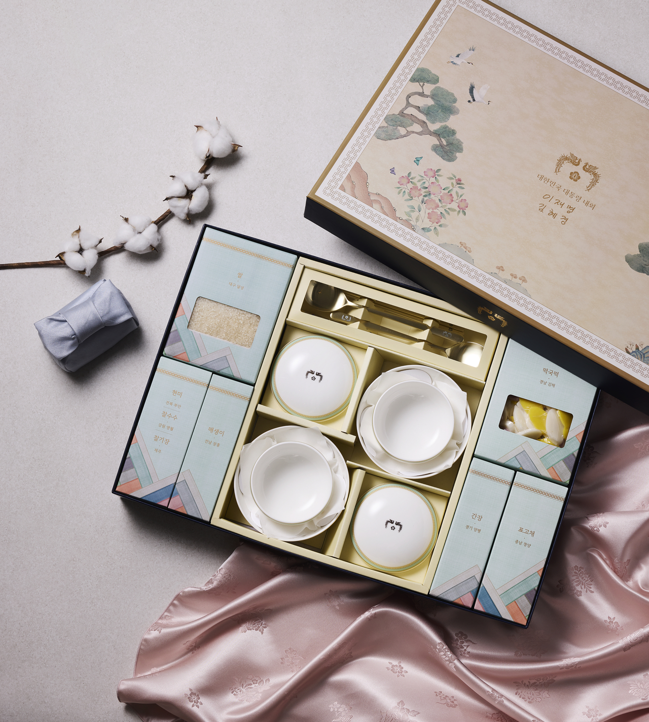 쌀(대구 달성)과 잡곡(전북 부안 현미, 강원 영월 찰수수, 제주 찰기장), 설 명절을 상징하는 떡국 떡(경남 김해), 겨울철 따뜻한 국 한 그릇을 떠올리게 하는 매생이(전남 장흥)·표고채(충남 청양)·전통간장(경기 양평)으로 구성했다.