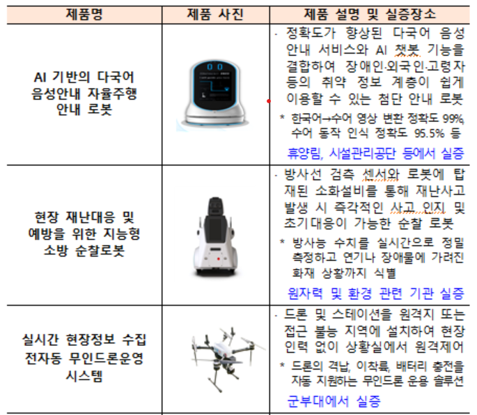 방사선 검측 센서와 소화설비를 탑재한 소방 순찰 로봇, 딥러닝 이미지 인식 기술을 활용한 의료 자동화 장치, 생성형 AI 기반 정보제공 서비스 등이 기술과 품질을 공공서비스 현장에서 검증을 통해 판로개척에 나선다.