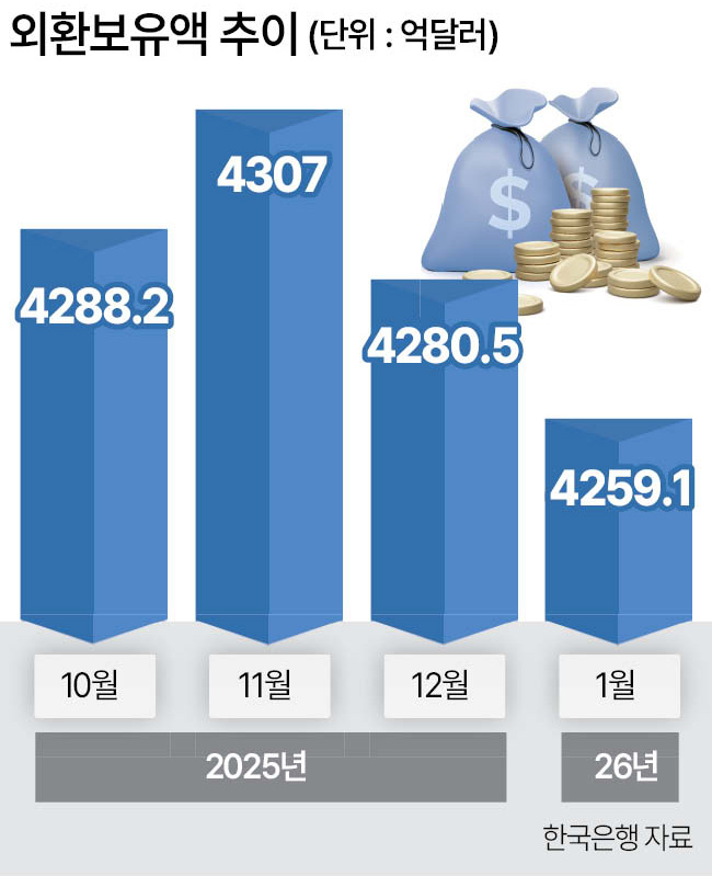 4일 한국은행이 발표한 ‘2026년 1월말 외환보유액’ 자료에 따르면 지난달 말 한국의 외환보유액은 4259억1000만달러로 지난해 12월 말(4280억5000만달러)보다 21억5000만달러 줄었다. 외환보유액은 지난해 12월 7개월 만에 감소세로 바뀐 뒤 두달 연속 줄었다. 지난달 외환보유액 잔액은 지난해 9월(4220억2000만달러) 이후 4개월 만에 최저치다.