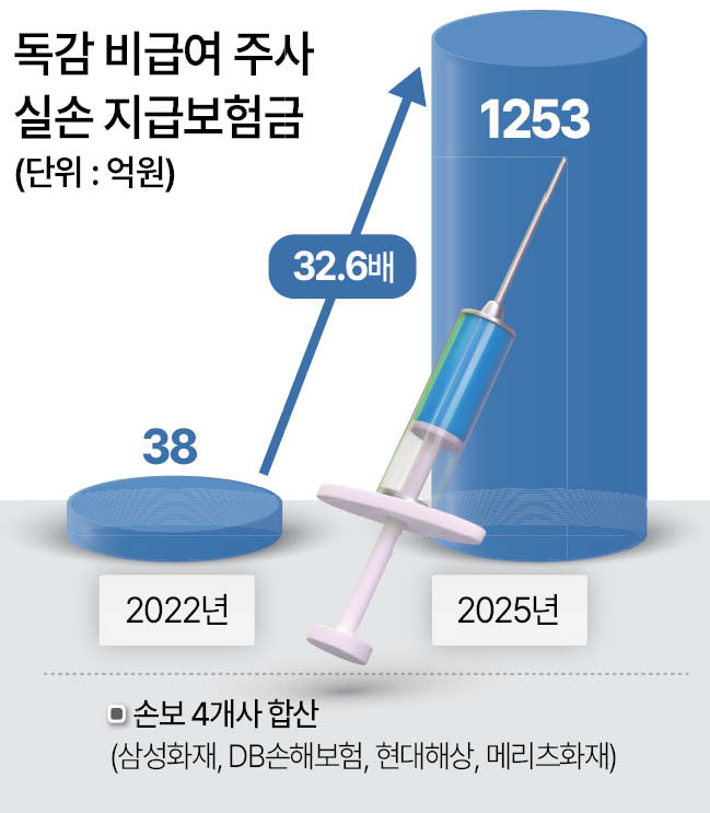 ▶38억원에서 1253억원으로…비급여 주사 폭증=5일 보험업계에 따르면 삼성화재·현대해상·DB손해보험·메리츠화재 등 국내 4개 주요 손해보험사가 지난해 1년간 지급한 비급여 주사제 보험금은 6122억원에 달했다. 1년 전(4416억원)보다 38.6% 늘었다. 3년 전인 2022년(2585억원)과 비교하면 2.4배 불어난 수치다. 지급된 보험금 중 급여가 차지하는 비중은 단 18.4%에 불과하다. 대부분 건강보험에 적용받지 않는 주사다. 지급 건수도 219만건에서 538만건으로 늘었다.