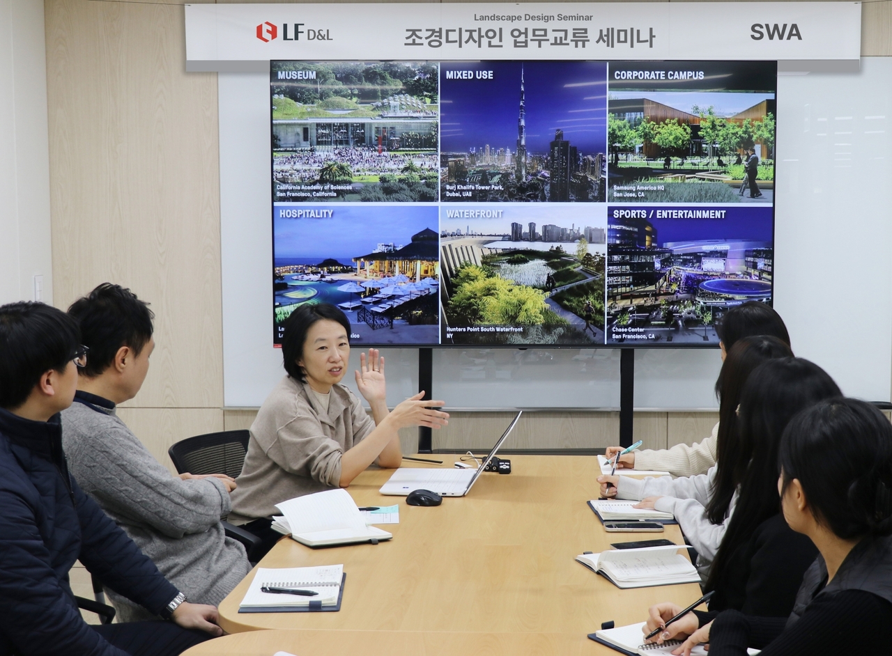 | [LF디앤엘 본사에서 열린 ‘LF디앤엘-SWA 조경 디자인 업무 교류 세미나’에서 각 사 관계자들이 조경 혁신 방안을 논의하고 있다.] |