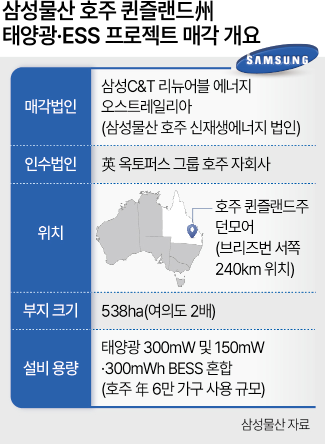 삼성물산 상사 부문은 최근 자사의 호주 퀸즐랜드주 태양광·ESS 프로젝트를 영국 옥토퍼스 그룹의 호주 자회사에 매각했다고 5일 밝혔다. 이번 계약은 삼성물산 호주 신재생에너지 법인인 삼성C&T 리뉴어블 에너지 오스트레일리아(SREA)가 옥토퍼스 오스트레일리아에 발전 사업권을 매각하는 방식으로 이뤄졌다. 이번 매각 건은 양사의 비밀유지 협의에 따라 금액이 공개되지 않았다.