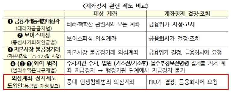 | 계좌정지 관련 제도 비교 [금융위원회 제공] |