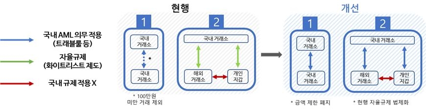 국내거래소가 개인지갑 혹은 해외거래소와 거래할 때는 송·수신인이 동일한 경우 등 저위험 거래만 허용한다. 고위험 해외거래소와의 거래는 금지된다. 국내거래소를 거치지 않는 해외거래소·개인지갑 간 거래는 위험거래로 간주해 거래금액 제한 등의 위험경감조치를 실시하도록 한다.