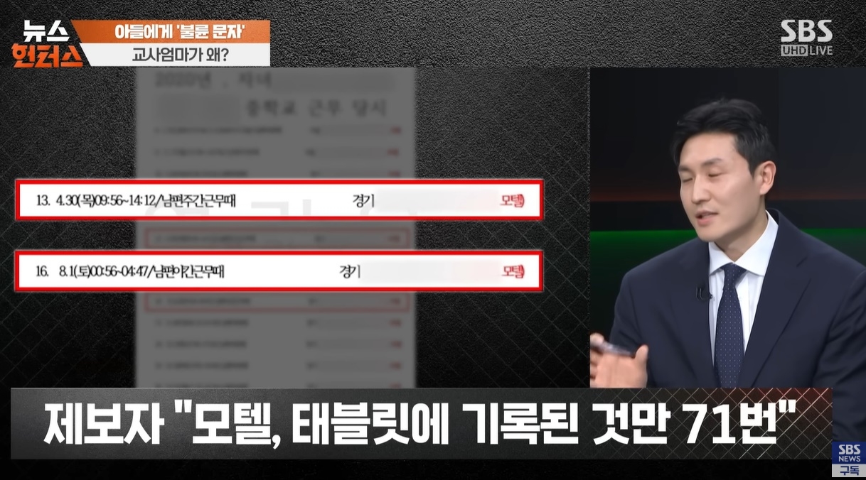 A씨는 전처가 아이가 5살 무렵부터 앱이나 오픈채팅을 통해 다른 남성과 만남을 이어왔으며, 아이가 잠든 사이 집을 비우는 일도 반복했다고 주장했다. 그는 “아이 교육용 태블릿에서 로그인이 된 아이 엄마의 타임라인을 우연히 보게 됐다”며 “거기에 모텔에 71번 방문한 기록이 찍혀 있었다”고 말했다.