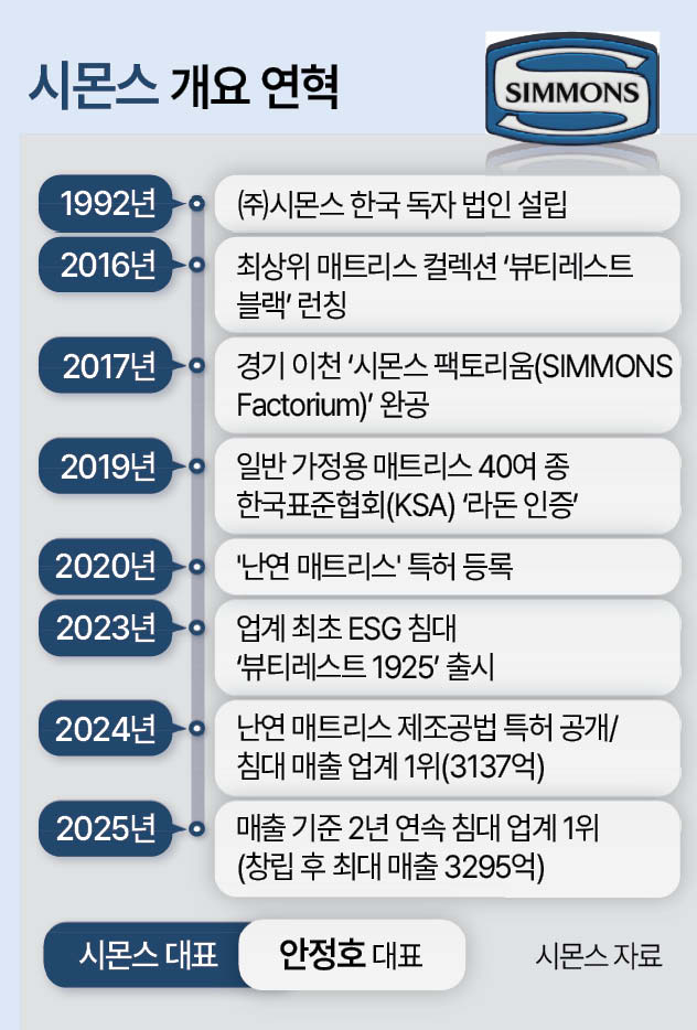 시몬스는 ‘인증에 진심인 회사’다. 한해 각종 인증과 난연 등 기능 유지에 사용되는 비용만 수십억원대를 헤아리는 것으로 알려진다. 지향하는 가치는 고객의 안전, 청결 두 가지다. 시몬스 관계자는 “하루 24시간 중 8시간 이상을 사람의 피부와 맞닿는 가구는 침대밖에 없다. 가장 안전해야 하는 곳이자 가장 청결해야 하는 곳이다. 그래서 비용 부담이 크지만 결코 양보할 수 없다”고 말했다.