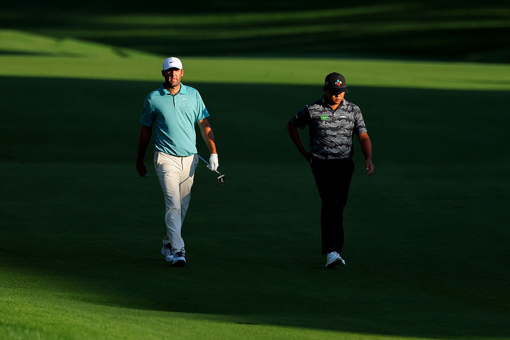 | 스코티 셰플러(왼쪽·미국)와 한국의 김시우가 지난 해 5월 18일 미 노스캐롤라이나주 샬럿에 위치한 퀘일 할로 컨트리클럽에서 열린 PGA 챔피언십 3라운드 경기 중 18번 페어웨이를 나란히 걷고 있다. [게티이미지] |