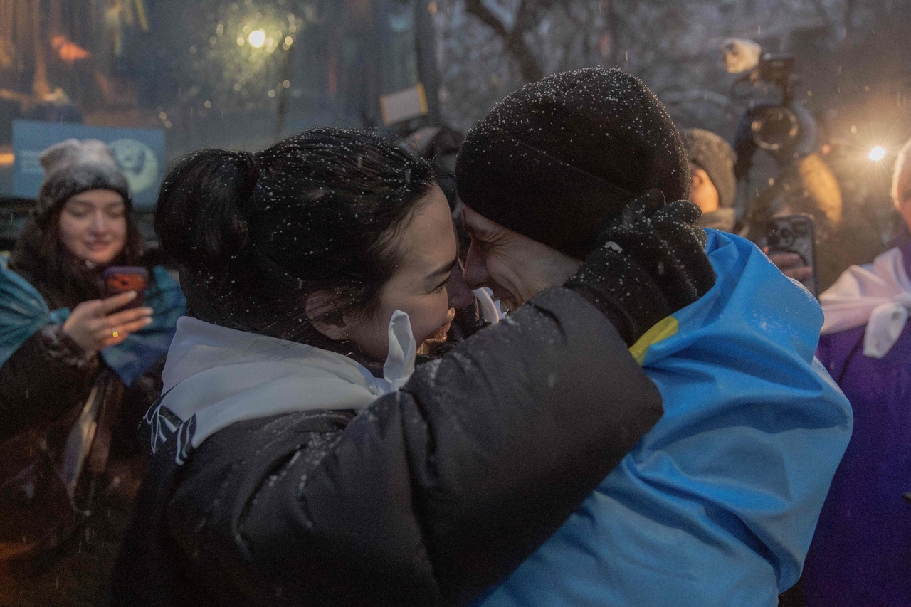 | 2022년 우크라이나의 마리우폴 방어전 당시 러시아에 포로로 잡혔던 한 남성이 5일(현지시간) 러시아와 우크라이나의 포로 교환으로 체르니히우 지역에서 아내를 만나 부둥켜 안고 있다.[AFP] |