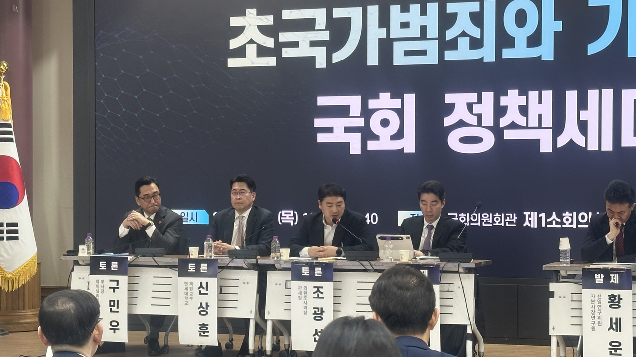 | 지난 5일 국회에서 열린 ‘초국가범죄와 가상자산 국회 정책세미나’에서 참석자들이 토론을 진행하고 있다. 경예은 기자 |