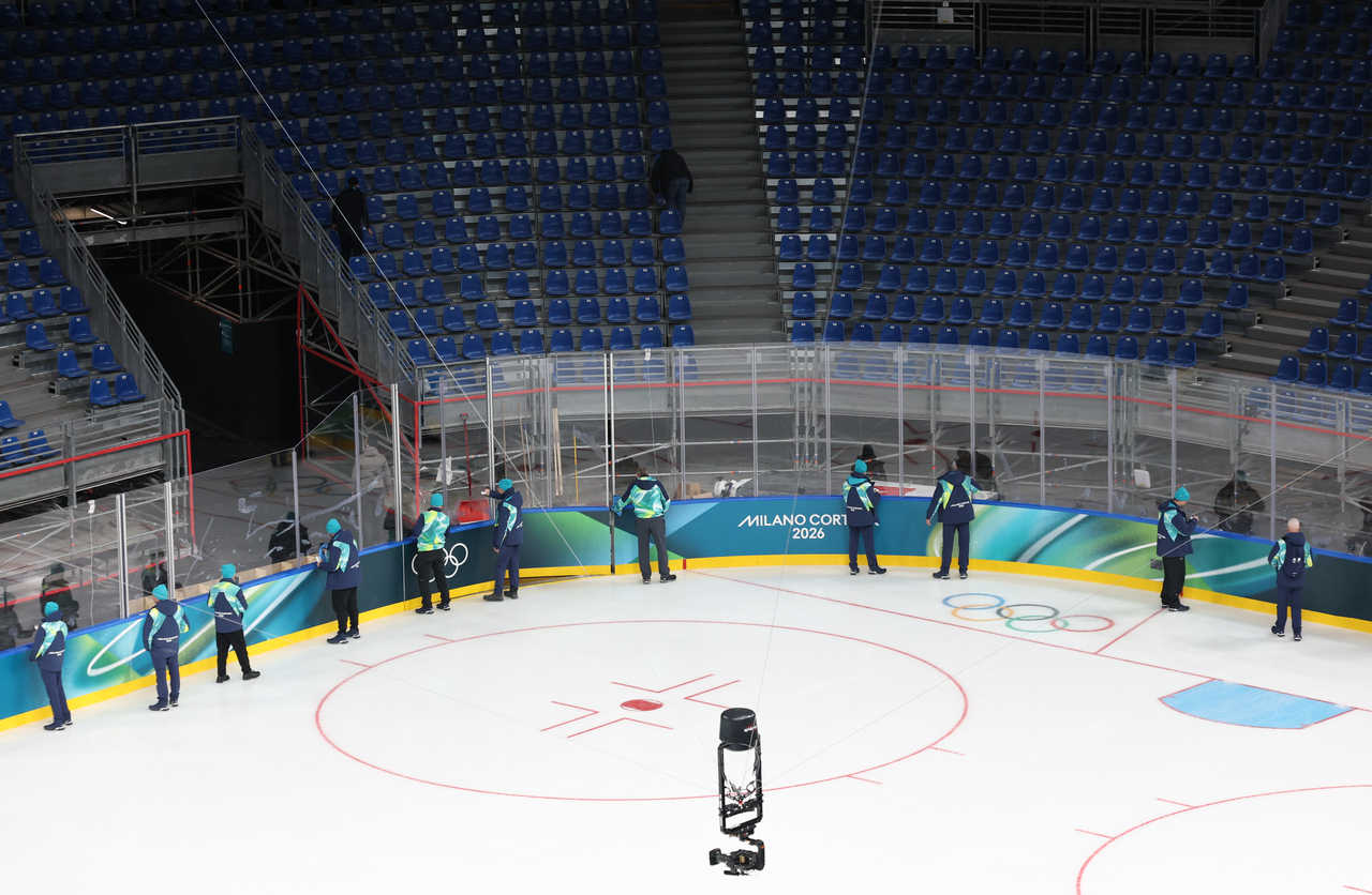 | 2026 밀라노-코르티나담페초 동계올림픽의 아이스하키 경기가 열릴 예정인 밀라노 산타줄리아 아이스하키 아레나에 막바지 준비작업이 한창인 모습. [연합] |